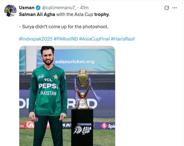 Also, Suryakumar did not attend the trophy photoshoot with the Pakistan captain ahead of the toss. Salman was seen posing with the big prize alone minutes before the toss on Sunday, September 28.