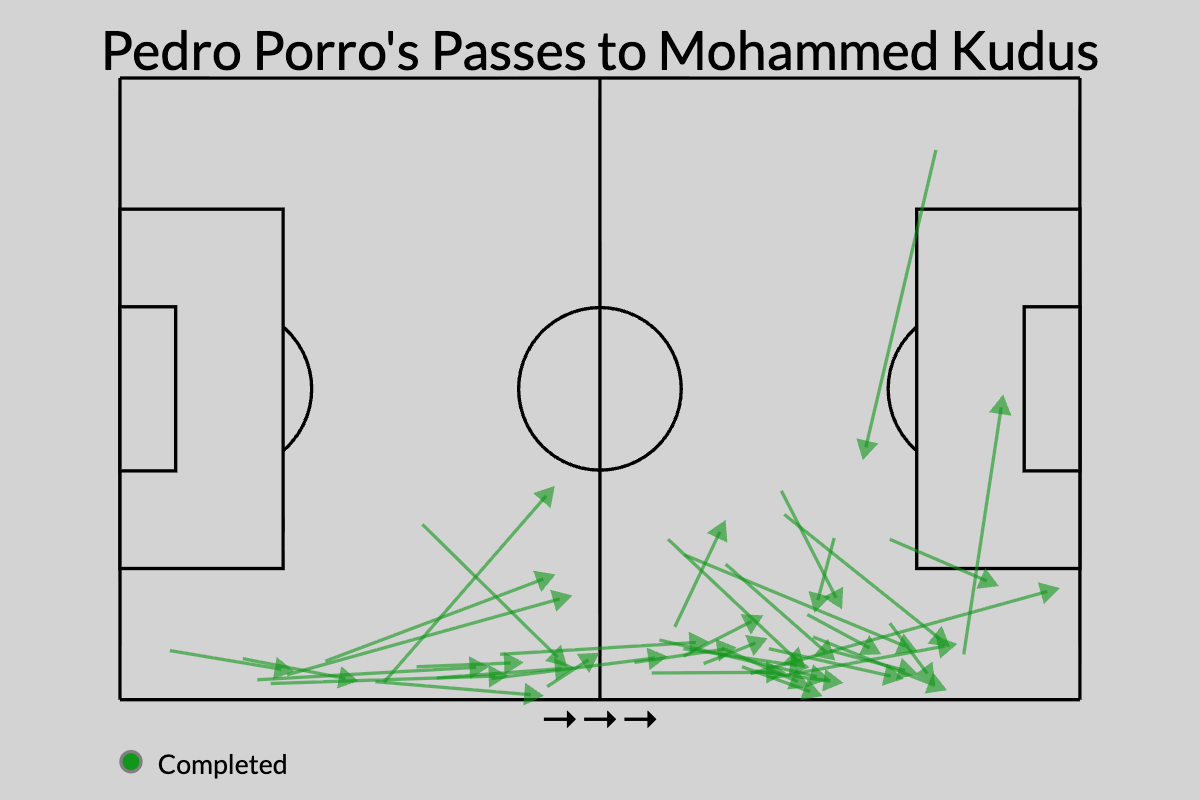 New manager Thomas Frank has clearly encouraged the team to bring Kudus into the game as often as possible. It suits Spurs to work the ball up the right flank anyway, as Porro has always been a good distributor and Cristian Romero, who plays right center back, is by far the most talented line-breaking passer at the club.