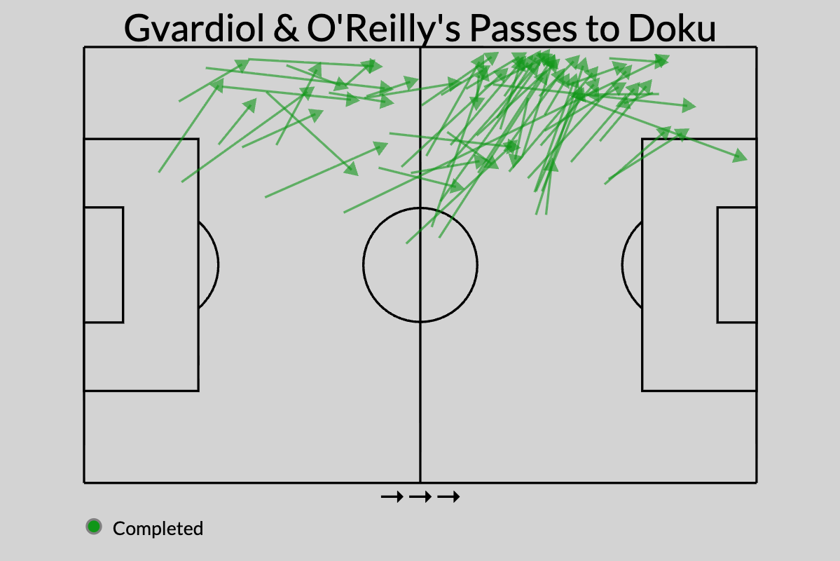 What is clear, though, is that City are using the wings to progress the ball. Doku's 32 passes received from Gvardiol and 31 from left back Nico O'Reilly ranks third and fourth in the team, while Oscar Bobb appears twice in the top 15, receiving 25 from midfielder Tijjani Reijnders and 23 from defender John Stones.