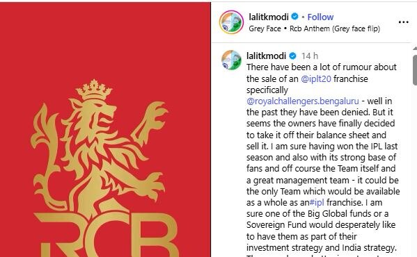 "There have been a lot of rumours about the sale of an @iplt20 franchise, specifically @royalchallengers.bengaluru. In the past, offers were denied, but it seems the owners have finally decided to take it off their balance sheet and sell it." Lalit Modi said in an Instagram post on Monday, September 29.
