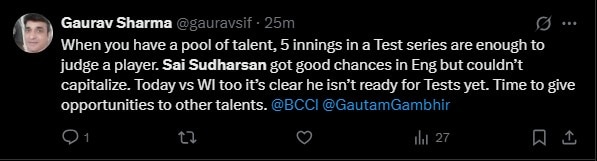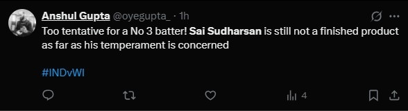 Following his latest failure in Ahmedabad, Sudharsan faced heavy trolling from fans, with some even suggesting that Karun Nair — dropped from the squad — would have scored a triple hundred in his place.