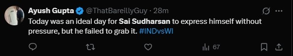 Sai Sudharsan’s struggles in Test cricket continued as he fell cheaply in the Ahmedabad Test against the West Indies at the Narendra Modi Stadium. Coming in at No. 3 after Yashasvi Jaiswal’s dismissal for 40 to Jayden Seales following a 68-run opening stand, Sudharsan once again failed to make an impact.