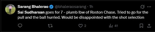Facing Roston Chase, the left-hander misjudged a quicker delivery that skidded onto middle stump. He went back attempting a pull shot but missed completely, with the ball striking his back leg plumb in front. The umpire raised his finger immediately, and Sudharsan walked back for seven off 19 balls, leaving India 90 for two in 24.5 overs.