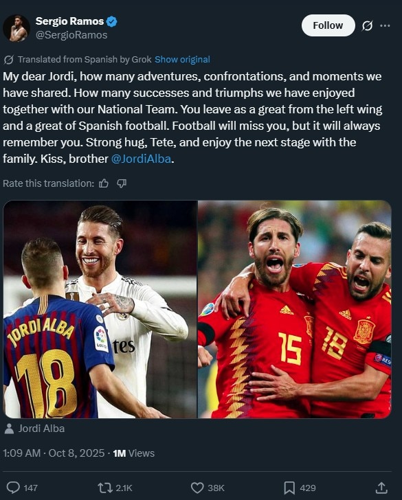 “My dear Jordi, how many adventures, confrontations, and moments we have shared,” Ramos wrote. “How many successes and triumphs we have enjoyed together with our National Team. You leave as a great from the left wing and a great of Spanish football. Football will miss you, but it will always remember you. Strong hug, Tete, and enjoy the next stage with the family. Kiss, brother,” Ramos wrote.